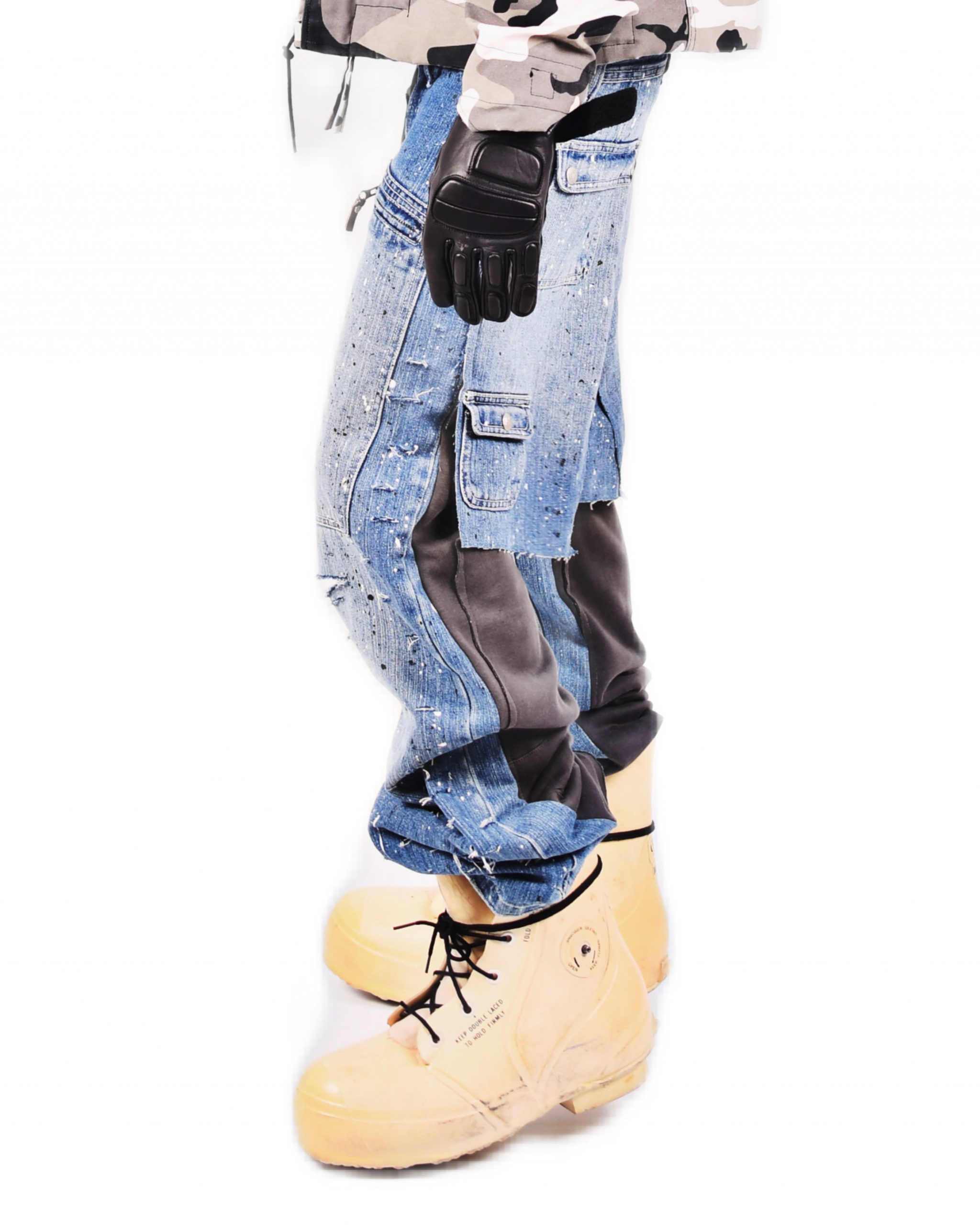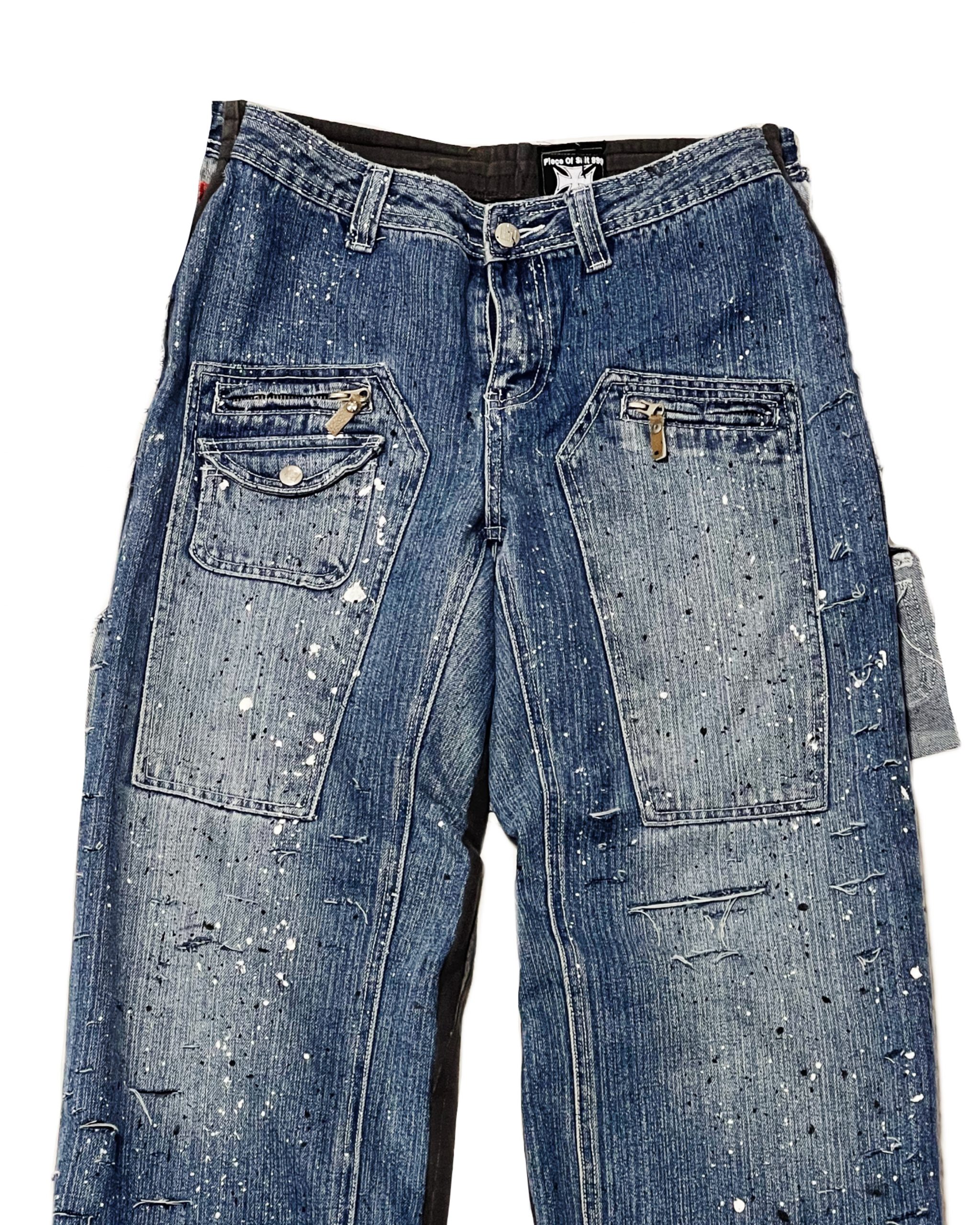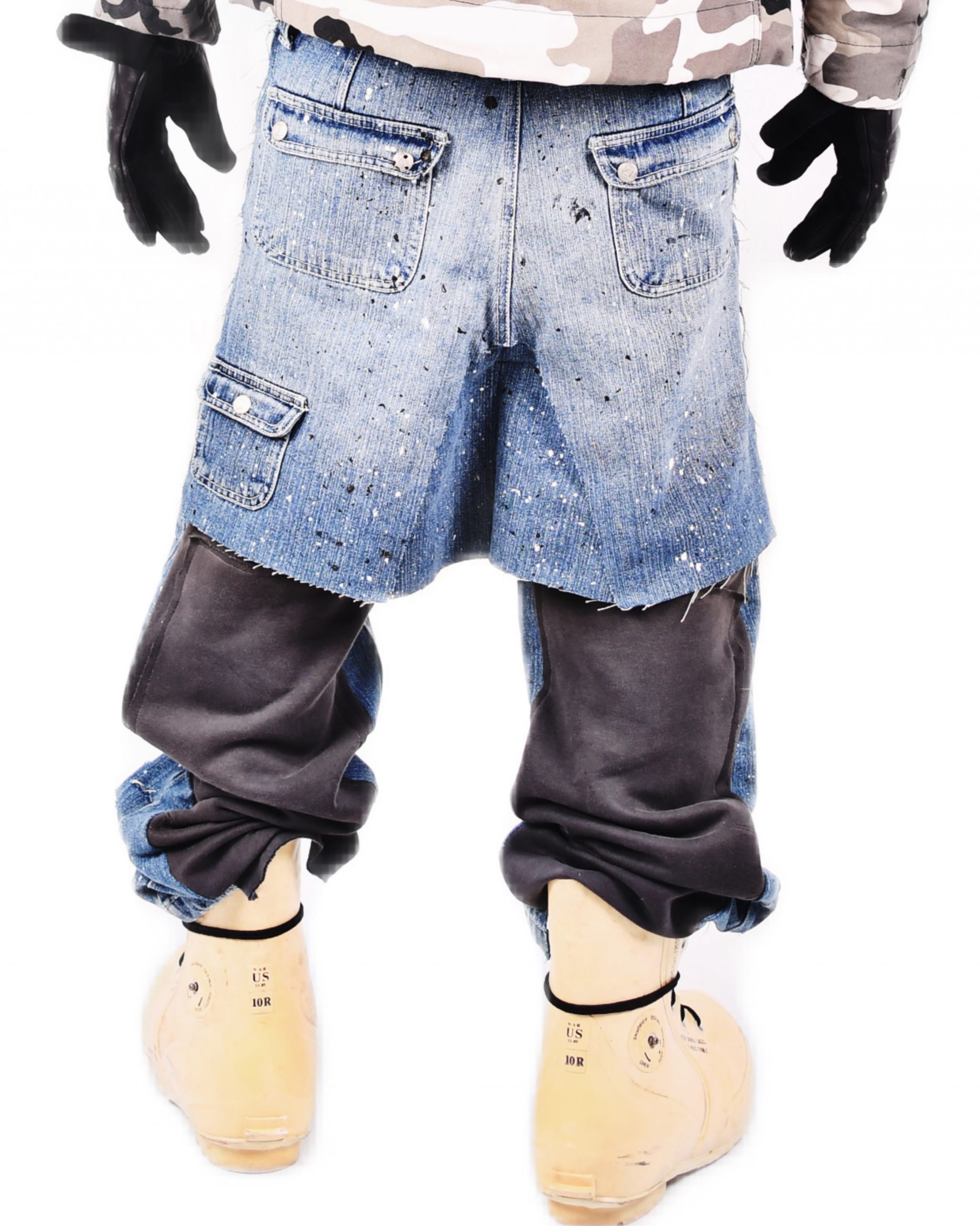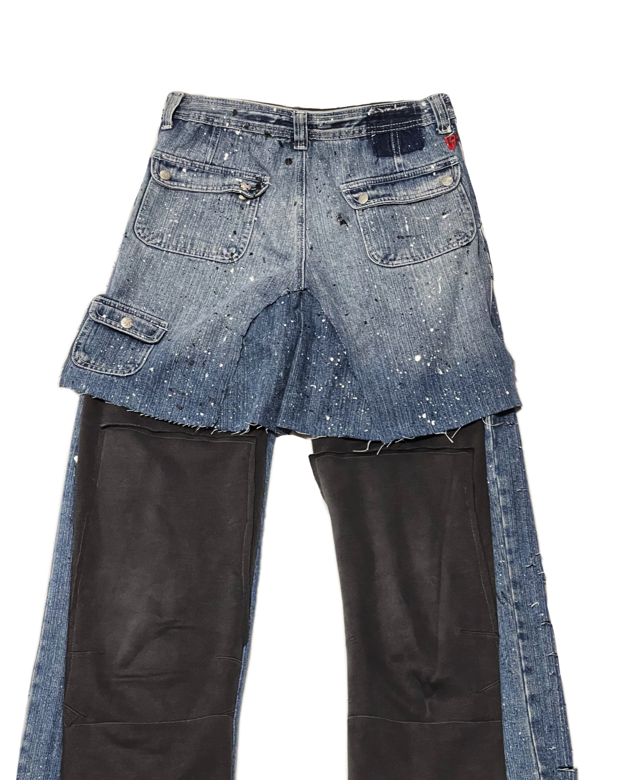 Jeans bleu destroy avec des taches de peinture légère poche longue zipé sur l’avant . Le derrière du pantalon est en matière sweat pant rattaché à un short denim.